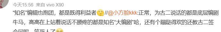 网友直言他们是当大编剧当久了,只会共情同为大编剧的秦雯,对古二这种在业界没有话语权的小透明,就表现出强烈的傲慢。