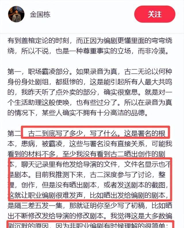 还有一位编剧金国栋在分析这件事的时候,质疑起了古二到底写了剧本的多少内容,手上到底有没有详细的证据,在他眼里,古二全程都在说自己很努力,却只想卖惨来要个名分,该有的证据一个都没有。